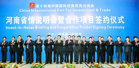 9月8日,在第十四屆中國(guó)國(guó)際投資貿(mào)易洽談會(huì)期間,河南省舉行了省情說明會(huì)暨合作項(xiàng)目簽約儀式。儀式上共簽約項(xiàng)目148個(gè),總投資524億元,涉及先進(jìn)制造業(yè)、現(xiàn)代服務(wù)業(yè)和基礎(chǔ)設(shè)施、農(nóng)林牧漁業(yè)等諸多領(lǐng)域。