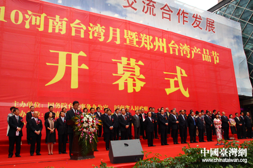 河南省委副書記、省長郭庚茂宣布“2010河南臺(tái)灣月暨鄭州臺(tái)灣產(chǎn)品節(jié)”開幕。中共中央臺(tái)灣工作辦公室、國務(wù)院臺(tái)灣事務(wù)辦公室主任王毅,海峽兩岸關(guān)系協(xié)會(huì)副會(huì)長王在希,國務(wù)院臺(tái)灣事務(wù)辦公室交流局局長李維一,中華全國臺(tái)灣同胞聯(lián)誼會(huì)副會(huì)長王松,中國國民黨中央評(píng)議委員會(huì)主席團(tuán)主席徐立德,新黨主席郁慕明,中國國民黨中央評(píng)議委員會(huì)主席團(tuán)主席張昌邦等出席開幕式。