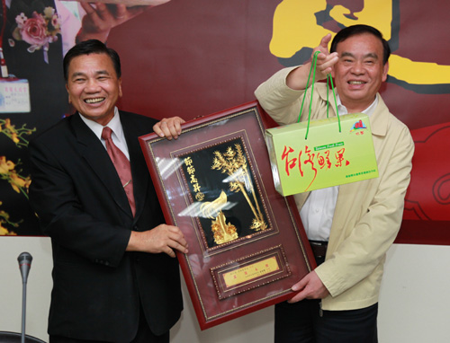 燕巢鄉(xiāng)鄉(xiāng)長(zhǎng)吳德雄向呂祖善省長(zhǎng)贈(zèng)送當(dāng)?shù)厮ㄕ憬∨_(tái)辦王健攝)