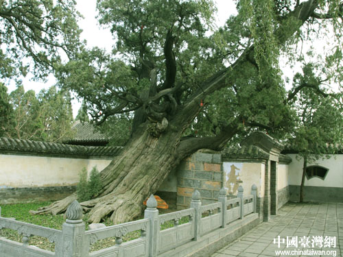 圖為“大將軍柏”。在嵩陽(yáng)書(shū)院的東側(cè),有一侏高大無(wú)比的古柏,其樹(shù)齡均在4000年以上,是中國(guó)現(xiàn)存最古老的柏樹(shù)。漢封將軍柏原有三棵,是漢武帝游嵩山時(shí)因見(jiàn)樹(shù)高大而封之為大將軍柏,二將軍柏和三將軍柏。三將軍柏清初被火燒毀,現(xiàn)存大將軍柏和二將軍柏。(中國(guó)臺(tái)灣網(wǎng) 徐維彬 攝)