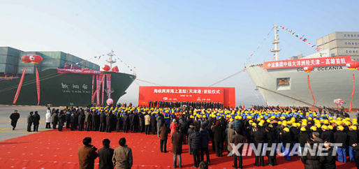 12月15日,在天津港碼頭,中國海運集團所屬的“新煙臺”輪和中國遠洋運輸集團“大洋洲”輪兩艘萬噸巨輪滿載著集裝箱整裝待發(fā)。當日,海峽兩岸海上直航首航儀式在天津東疆保稅港區(qū)舉行。新華社記者劉海峰攝
