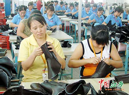 翻看在黎川投資的臺資鞋業(yè)企業(yè),大川鞋業(yè)公司生產(chǎn)的“達芙妮”品牌赫然醒目。江西大川鞋業(yè)公司是“臺灣永恩集團”的子公司,2006年9月落戶黎川,第二年3月一期工程即開始生產(chǎn)。公司副理蔡麗珠認為:“東部沿海鞋業(yè)結(jié)構(gòu)正在調(diào)整和升級,勞動密集型企業(yè)向內(nèi)地轉(zhuǎn)移的趨勢非常明顯,選擇黎川主要是這邊就是在用工和交通方面這些因素,毗鄰福建臺灣,對轉(zhuǎn)移鞋業(yè)產(chǎn)業(yè)具有很大的吸引力!