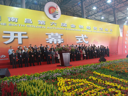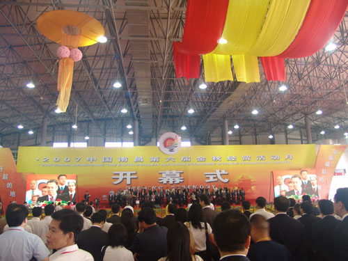 中國臺灣網8月31日南昌消息 昨日上午,以“軍旗升起的地方,和諧崛起的南昌”為主題的“2007中國南昌第六屆金秋經貿活動月”在南昌國際展覽中心隆重開幕。改圖為嘉賓在開幕式上致辭。