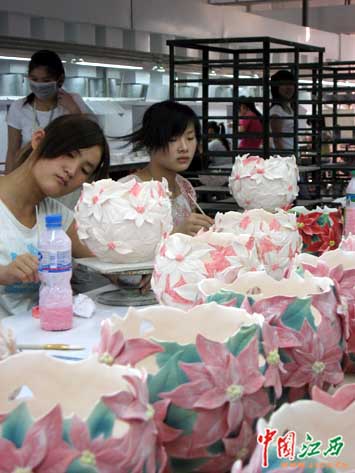 在法藍(lán)瓷景德鎮(zhèn)生產(chǎn)基地,技術(shù)工人正在熟練地進(jìn)行繪色工序。(江西網(wǎng) 王建亮 攝)