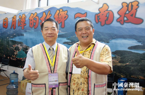 南投縣政府觀光處處長洪文能(左)和南投金都餐廳總經(jīng)理王文正,向大陸同胞推介南投這個(gè)觀光旅游的好地方。(中國臺(tái)灣網(wǎng)記者 張弛 攝)
