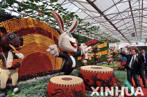4月20日,使用各種豆類制作的卡通塑像吸引眾多參觀者。新華社記者 朱崢 攝