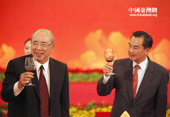 5月8日晚,中共中央臺灣工作辦公室為第七屆兩岸經(jīng)貿(mào)文化論壇舉行歡送晚宴。圖為中臺辦主任王毅與中國國民黨榮譽主席吳伯雄共同舉杯慶祝論壇取得圓滿成功!。ㄖ袊_灣網(wǎng) 田云鵬 攝)