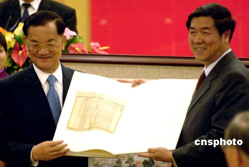 廈門市向連戰(zhàn)一行贈送連戰(zhàn)祖父當(dāng)年在廈門辦報(bào)的珍貴資料