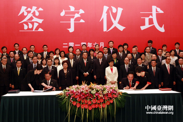 6月29日下午,海協(xié)會(huì)與臺(tái)灣;鶗(huì)在重慶申基索菲特大酒店,舉行兩岸經(jīng)濟(jì)合作框架協(xié)議(ECFA)以及兩岸知識(shí)產(chǎn)權(quán)保護(hù)合作協(xié)議簽字儀式。(中國(guó)臺(tái)灣網(wǎng) 鐘寶華 攝)