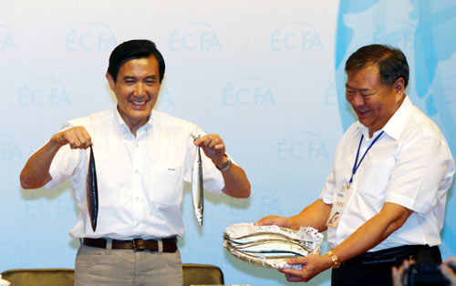 馬英九昨天到高雄市出席“兩岸經(jīng)濟(jì)合作架構(gòu)協(xié)議(ECFA)座談會(huì)”,與養(yǎng)殖、鋼鐵等業(yè)界座談。業(yè)者都非常感謝臺(tái)當(dāng)局簽訂ECFA,讓業(yè)界獲益良多。受益的業(yè)者甚至提來一堆秋刀魚、石斑送給馬英九,讓現(xiàn)場(chǎng)響起熱烈掌聲。