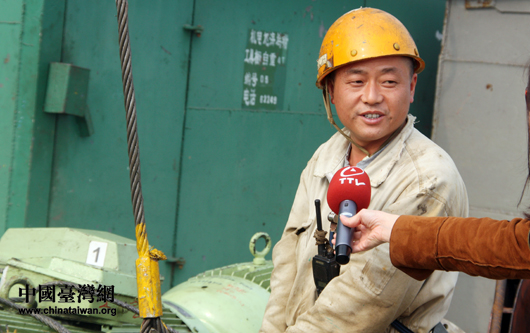 兩岸媒體7日上午參觀了中遠(yuǎn)川崎,圖為公司工人接受臺(tái)視采訪。 (中國臺(tái)灣網(wǎng) 王偉 攝)