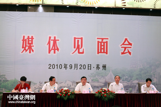 9月20日,蘇州市委副書(shū)記、市長(zhǎng)閻立(中)等同采訪“江蘇臺(tái)灣周”的各路媒體記者見(jiàn)面,介紹了蘇州與臺(tái)灣經(jīng)貿(mào)合作交流情況。(中國(guó)臺(tái)灣網(wǎng) 鐘寶華 攝)