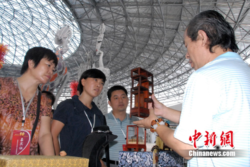 在東南東文化創(chuàng)意產(chǎn)業(yè)園內(nèi)舉辦的2010海峽兩岸特色產(chǎn)品博覽會吸引了全國各地的觀眾,圖為參展藝術(shù)家向觀眾展示自己的作品。
