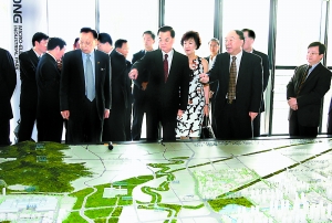 西永微電子園毗鄰重慶大學(xué)城,人才優(yōu)勢與高科技產(chǎn)業(yè)有機結(jié)合,吸引了大量集成電路、軟件服務(wù)等項目入駐。在西永微電子產(chǎn)業(yè)園區(qū)開發(fā)有限公司,連戰(zhàn)先生一行駐足在沙盤前,饒有興致地聽取黃奇帆的情況介紹。