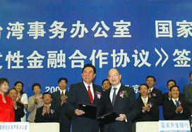 “中國臺灣網(wǎng)7月10日消息 今日下午,國務(wù)院臺灣事務(wù)辦公室和華夏銀行股份有限公司在人民大會堂簽署《支持臺資企業(yè)發(fā)展合作協(xié)議》,在五年期內(nèi),華夏銀行為臺資企業(yè)意向性提供總額為200億元的融資支持和多種金融服務(wù)。國務(wù)院臺辦主任陳云林、華夏銀行董事長劉海燕分別致辭,國務(wù)院臺辦主任陳云林和華夏銀行行長吳建在合作協(xié)議上簽字……”