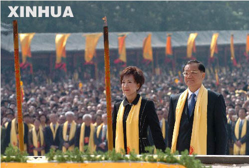4月19日,中國(guó)國(guó)民黨榮譽(yù)主席連戰(zhàn)及夫人在河南新鄭市參加丁亥年黃帝故里拜祖大典。 新華社記者 趙鵬攝