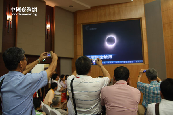 兩岸鄉(xiāng)村代表22日上午在上海青浦會(huì)議中心觀看500年一遇的日全食景觀。(中國臺(tái)灣網(wǎng) 邵磌 攝)