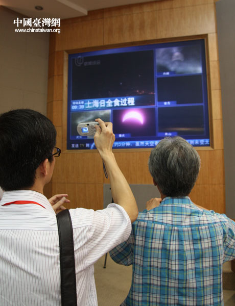 中國臺灣網(wǎng)7月22日上海消息 參加首屆“兩岸鄉(xiāng)村座談”的兩岸代表今天通過電視直播在上海青浦會議中心觀看了500年一遇的日全食景觀。代表們對日全食奇觀贊嘆不已、大呼過癮,紛紛表示這是他們本次來上海參加鄉(xiāng)村座談外的又一重大收獲。