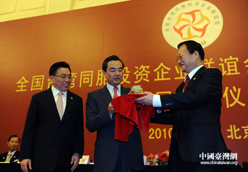 中臺(tái)辦、國(guó)臺(tái)辦主任王毅出席全國(guó)臺(tái)企聯(lián)第二屆會(huì)長(zhǎng)換屆交接儀式,首屆會(huì)長(zhǎng)張漢文(右一)、第二屆會(huì)長(zhǎng)郭山輝(左一)。(中國(guó)臺(tái)灣網(wǎng)發(fā))