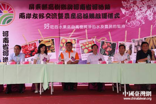 10:30分,郭庚茂一行冒雨參加屏東縣高樹(shù)鄉(xiāng)與河南省河洛鎮(zhèn)兩岸友好交流暨農(nóng)產(chǎn)品采購(gòu)啟運(yùn)儀式,并宣布農(nóng)產(chǎn)品采購(gòu)啟運(yùn)開(kāi)始。據(jù)介紹,河南省今年將在臺(tái)灣分批采購(gòu)835萬(wàn)元人民幣的農(nóng)特產(chǎn),此次第一批次采購(gòu)330萬(wàn)元人民幣,共1萬(wàn)2000箱木瓜、菠蘿和芒果。 其余的505萬(wàn)元人民幣的農(nóng)特產(chǎn)品將分別在7月底及12月底前完成采購(gòu)任務(wù)。啟動(dòng)儀式上,高樹(shù)鄉(xiāng)長(zhǎng)廖文賢與河南省河洛鎮(zhèn)鎮(zhèn)長(zhǎng)逯雨林還簽定結(jié)為兄弟聯(lián)誼鄉(xiāng)鎮(zhèn),成為河南與臺(tái)灣首家結(jié)隊(duì)鄉(xiāng)鎮(zhèn)。
