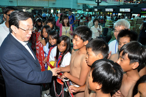 河南省長郭庚茂(左)結(jié)束訪臺行程,23日搭機(jī)離臺,有少數(shù)民族小朋友穿著傳統(tǒng)服飾送機(jī),場面熱鬧。 圖片來源:“中央社”