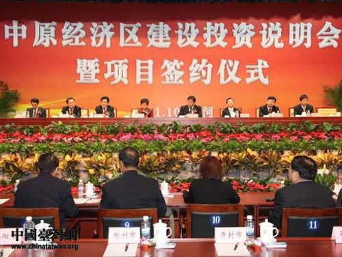“2011豫臺(tái)經(jīng)貿(mào)洽談會(huì)暨臺(tái)商中原行”之中原經(jīng)濟(jì)區(qū)建設(shè)投資說明會(huì)暨項(xiàng)目簽約儀式在河南漯河舉行。(圖片來源:河南省臺(tái)辦)