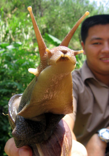 2006年8月26日晚,福州農(nóng)大學(xué)生小廖在回宿舍的路上,發(fā)現(xiàn)一只長(zhǎng)達(dá)17厘米,重約300克的巨型蝸牛。后來(lái)小廖因?yàn)楹闷姘堰@只大家伙帶回宿舍過(guò)了一夜。