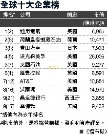 據香港《文匯報》消息,《福布斯》根據綜合評分定出是項排名,營業(yè)額、盈利、資產和市值占同等比重。三甲位置分別由美國通用電氣、荷蘭皇家蜆殼石油和日本豐田汽車奪得,十大位置中,美國占了5席。