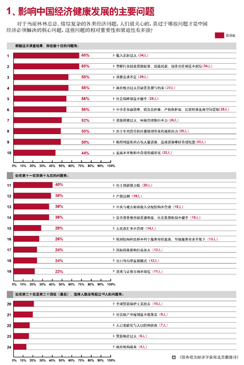 50位有造詣的中國(guó)經(jīng)濟(jì)學(xué)家在我們梳理的林林總總、錯(cuò)綜復(fù)雜的各類經(jīng)濟(jì)問(wèn)題中,選擇了各自心目中“影響中國(guó)經(jīng)濟(jì)健康發(fā)展的主要問(wèn)題”。