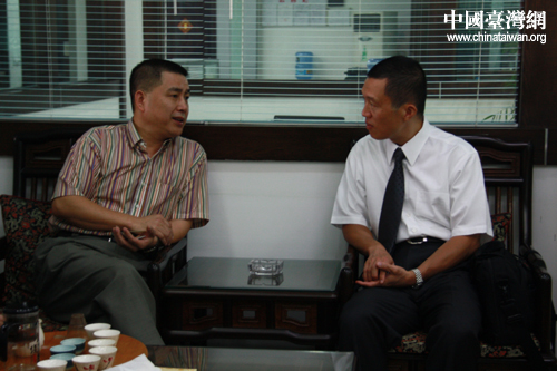 知名講師鄭琳鋒與飛鴻五金飾品有限公司總經(jīng)理陳建明進(jìn)行內(nèi)訓(xùn)前交流。(中國(guó)臺(tái)灣網(wǎng) 胡珊珊 攝)