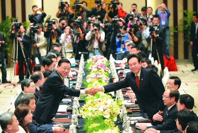 4月26日上午,海峽兩岸關(guān)系協(xié)會(huì)會(huì)長(zhǎng)陳云林(右)與海峽交流基金會(huì)董事長(zhǎng)江丙坤在南京舉行會(huì)談。這是兩會(huì)恢復(fù)協(xié)商后領(lǐng)導(dǎo)人第三次會(huì)談。新華社記孫參攝