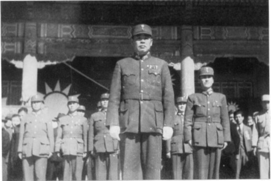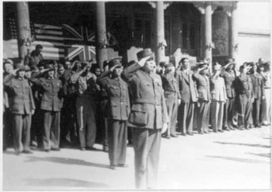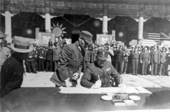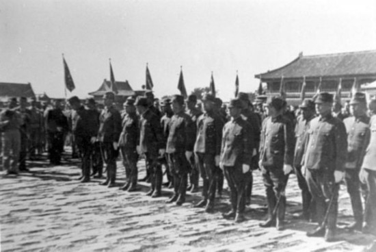 中國(guó)受降主官召日軍投降代表華北方面軍司令官根本博中將率領(lǐng)參謀長(zhǎng)高橋坦以下廿一員幕僚入場(chǎng)。