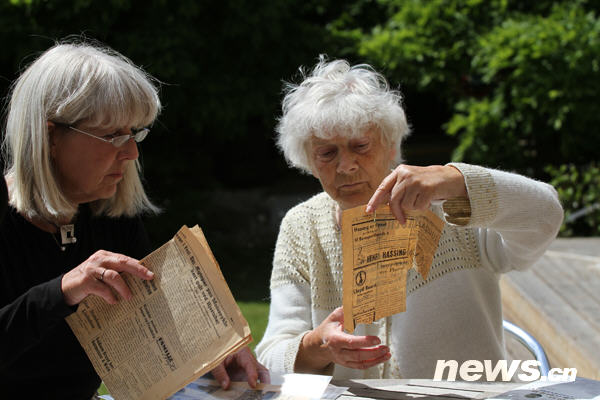 6月26日,在丹麥第二大城市奧胡斯郊區(qū)的一棟海濱別墅里,抗戰(zhàn)期間在南京救助和保護了近2萬名中國難民的丹麥友人貝恩哈爾·辛德貝格的妹妹比滕·安諾生(右)和外甥女瑪麗安娜·安諾生向記者展示有關(guān)南京大屠殺的史料。新華社發(fā)(林淼攝)