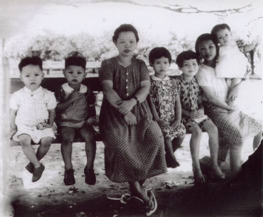 左起:作者謝雨辰、三哥、母親、二姐、大姐、保姆、大妹(攝于1945年臺灣臺中公園)