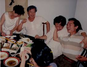 左上:左起大姐、二哥、作者謝雨辰和五弟,酒后笑談童年糗事,樂不可支。 右上:開懷大笑的三哥和作者謝雨辰 左下:離臺前夕,作者妻子的六哥六嫂(中間站里唱歌者)為北京的妹妹和妹夫歡歌送行,攝于臺北盧州家中 右下:(左)大妹與(右)二妹倆人爭著為頻繁應酬的四嫂(作者妻子)按摩,舒解疲勞,姑嫂情深