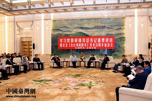中國臺灣網(wǎng)1月4日北京消息 臺盟中央、全國臺聯(lián)4日上午在人民大會堂舉行學(xué)習(xí)胡錦濤總書記重要講話暨紀(jì)念《告臺灣同胞書》30周年座談會。