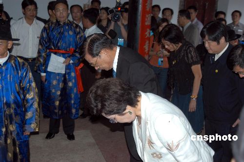 五月二十一日上午,中國國民黨副主席江丙坤回到福建漳州平和縣大溪鎮(zhèn)江寨村尋根祭祖。十時(shí)五十分,江丙坤夫婦走進(jìn)了江氏祖祠“濟(jì)陽堂”,早已等候在那里的兩位年輕宗族按古禮捧上甜茶,表示對(duì)貴客的歡迎。 作者:林國瑞