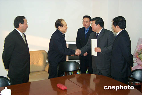 2005年1月31日,海協(xié)會長汪道涵(左二)在上海委托其個人代表孫亞夫(右二)和李亞飛(中)赴臺悼念已故的海基會會長辜振甫。