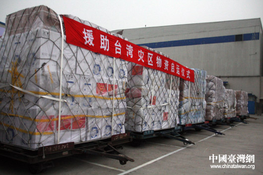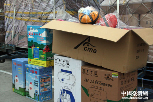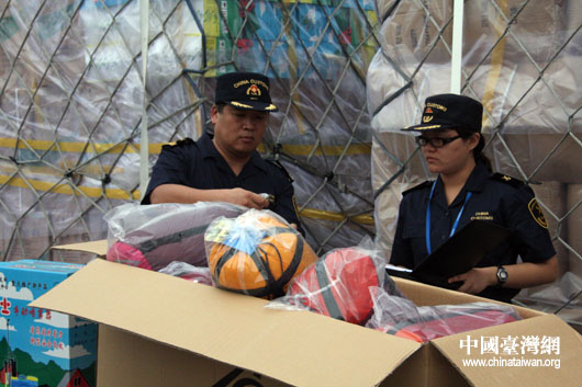 海關(guān)人士檢查即將啟運的救災(zāi)物資。(中國臺灣網(wǎng) 鐘寶華 攝)