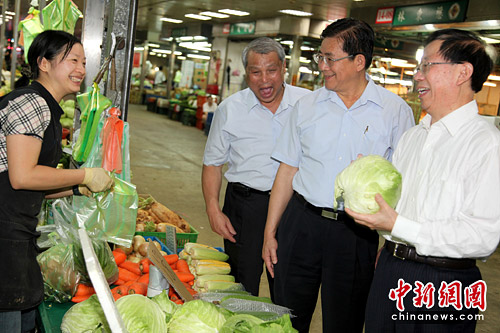5月20日上午,以海峽兩岸農(nóng)業(yè)交流協(xié)會(huì)名譽(yù)會(huì)長(zhǎng)身份首度訪臺(tái)的農(nóng)業(yè)部副部長(zhǎng)危朝安參觀臺(tái)北農(nóng)產(chǎn)運(yùn)銷(xiāo)公司第二果菜批發(fā)市場(chǎng),嘗水果、問(wèn)菜價(jià)。圖為危朝安(右)拿起一棵高麗菜,與女菜農(nóng)親切交談。 中新社發(fā) 董會(huì)峰 攝