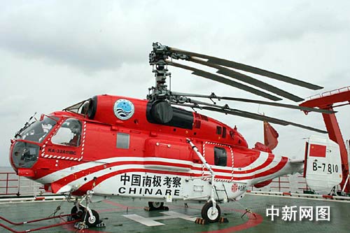 在“雪龍”號(hào)船尾的停機(jī)坪上,記者見到了中國(guó)南極考察首架自備卡-32直升飛機(jī)。由于在航行過程中需要存放在船上的機(jī)庫(kù)中,所以飛機(jī)螺旋槳的旋翼還未展開。船員告訴記者,該型直升機(jī)吊掛能力可達(dá)4噸,是以前船載機(jī)型的4倍左右,成為南極地區(qū)目前使用的最大噸位直升機(jī)。它可直接進(jìn)行船岸之間來回運(yùn)輸,更好地滿足南極新老三座考察基地的物資保障需求。另外,“雪龍”號(hào)此次科考任務(wù)同樣將配備兩架直升飛機(jī),除了該架自備卡-32外,另外一架從國(guó)外租借的直升飛機(jī)將在新西蘭上船。