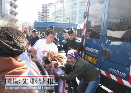 本報記者親眼看到,一個“藏獨”分子突然跳進安全防護欄,旁邊的法國警察眼疾手快,迅速把他按倒在地,然后扔出了安全防護欄。即使遇到一些政客出來挑事,警察也同樣不會客氣。據(jù)英國《衛(wèi)報》記者記述,一個巴黎市綠黨議員在火炬接力開始時突然表示抗議,很快被警察請了出去。然而正如那位中國記者所說,“氣囊”畢竟不是“金鐘罩”!懊鎸母鱾角落蹦出來的搗亂分子,面對搗亂分子亂扔?xùn)|西,警察們偶爾也會覺得首尾難顧。這時候,現(xiàn)場指揮人員只能讓火炬手上車,甚至主動熄滅火炬!