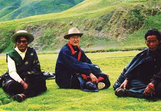格勒(中)在藏區(qū)考察時(shí)和牧民在一起(格勒提供)
