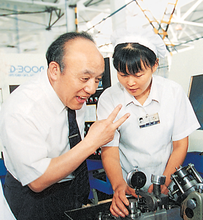 圖為魯冠球(左)了解技術(shù)改造問題。 | |