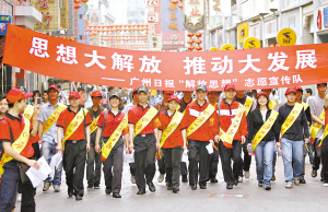 廣州日報紅色方陣高舉“思想大解放,推動大發(fā)展”橫幅備受市民關(guān)注。 顧展旭 攝