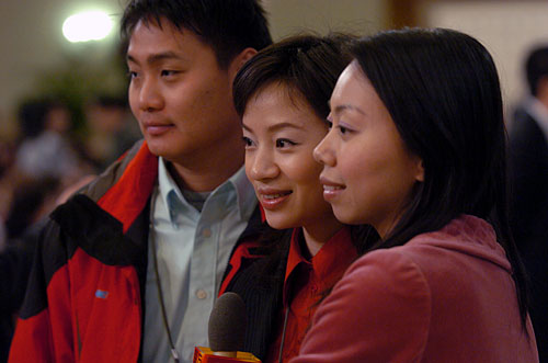 3月18日上午十一屆全國(guó)人大一次會(huì)議閉幕后,國(guó)務(wù)院總理溫家寶在人民大會(huì)堂三樓中央大廳與采訪十一屆全國(guó)人大一次會(huì)議的中外記者見(jiàn)面并回答記者提出的問(wèn)題。圖為記者們?cè)诤嫌啊P氯A網(wǎng) 陳競(jìng)超 攝