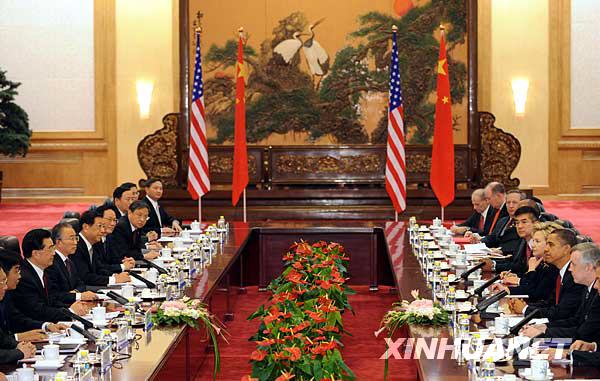 11月17日上午,中國國家主席胡錦濤在北京人民大會堂東大廳與美國總統(tǒng)奧巴馬舉行正式會談。新華社記者 黃敬文 攝