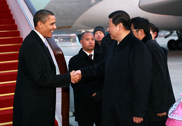 11月16日下午,美國總統(tǒng)奧巴馬乘專機從上海飛抵北京,國家副主席習近平前往北京首都國際機場迎接。新華社記者 龐興雷 攝