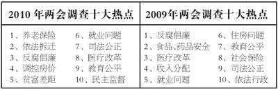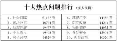 全國(guó)兩會(huì)將于3月初在京開幕。1月底,人民網(wǎng)推出“2011兩會(huì)調(diào)查:你最關(guān)心的十大熱點(diǎn)問題”調(diào)查。截至2月22日22時(shí),共有108420人參與投票,從18個(gè)關(guān)鍵詞中選出了“十大熱點(diǎn)問題”(見表格)。