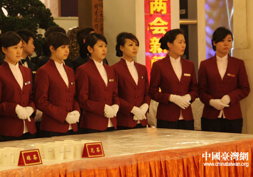 人民大會(huì)堂內(nèi)茶歇處服務(wù)人員。(中國(guó)臺(tái)灣網(wǎng) 高斯斯 攝)